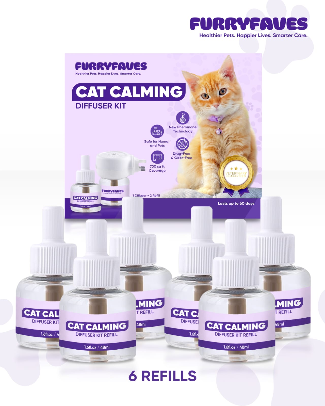 This refill pack includes 6 easy-to-use refills for your FurryFaves Cat Calming Diffuser (diffuser head not included). Perfect for pet parents who already have the diffuser and want to maintain a peaceful, stress-free environment for their cats. Ideal for reducing anxiety, easing tension, and promoting overall relaxation in multi-cat homes or during stressful events.